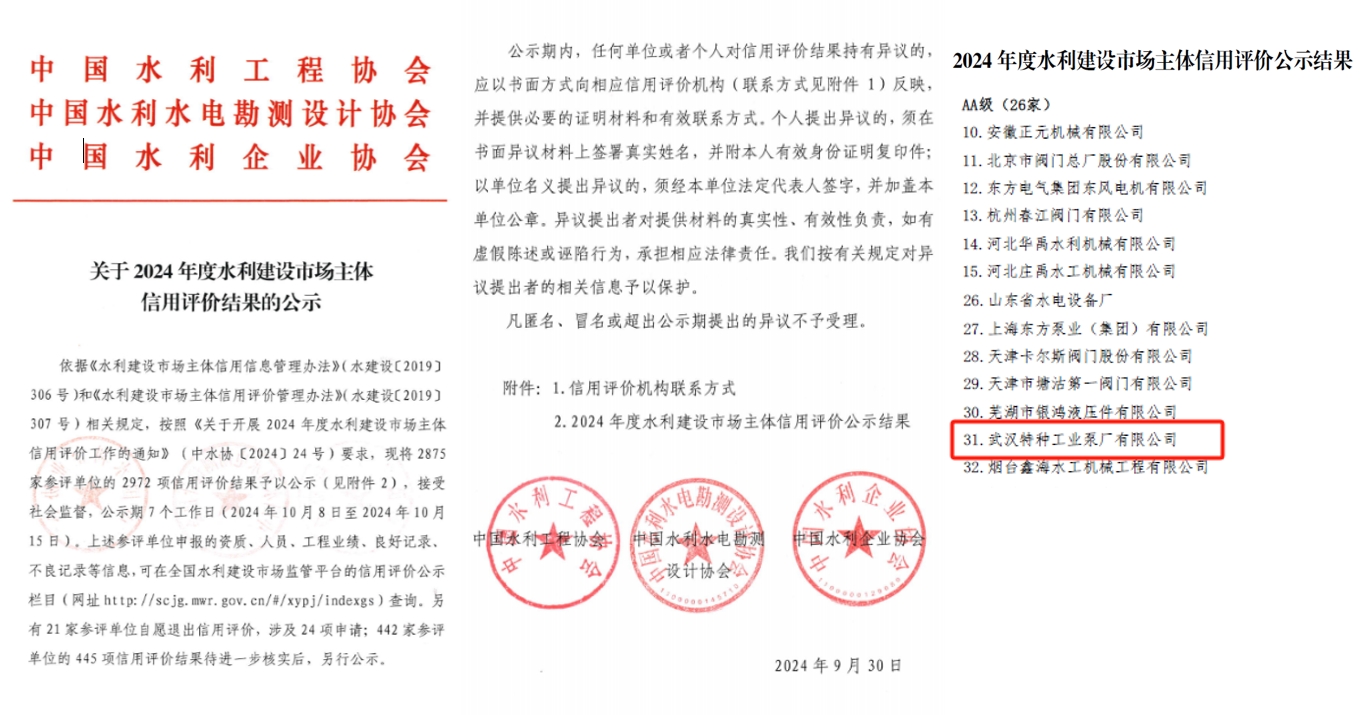 近日,由中國水利工程協(xié)會(huì)發(fā)布的2024年度水利建設(shè)市場(chǎng)主體信用評(píng)價(jià)結(jié)果中,武漢特種工業(yè)泵廠有限公司榮獲AA級(jí)機(jī)械制造單位稱號(hào),這一榮譽(yù)不僅是對(duì)公司過往成就的認(rèn)可,也是對(duì)我司在水利機(jī)械制造領(lǐng)域?qū)I(yè)實(shí)力和市場(chǎng)信譽(yù)的肯定。