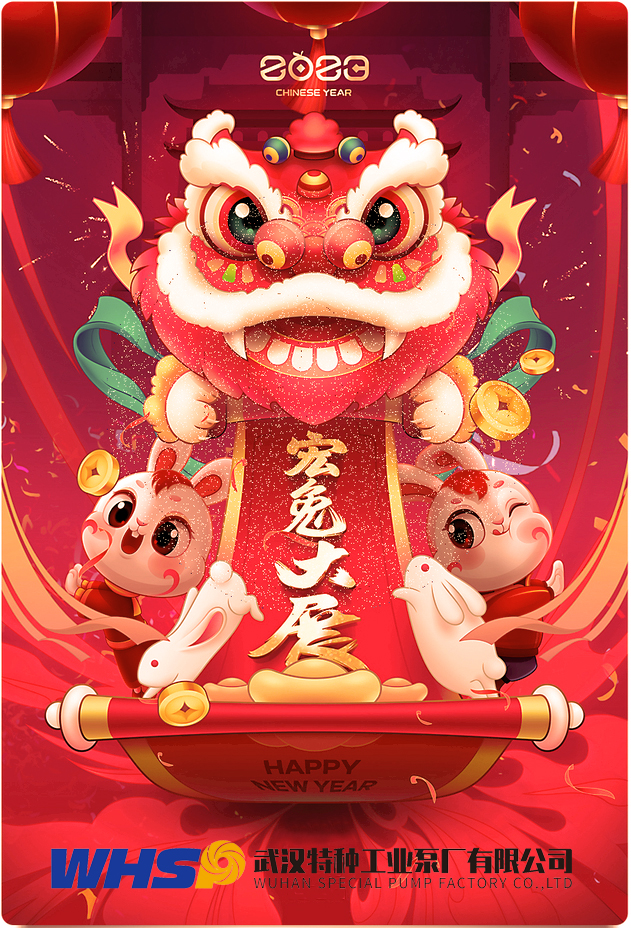 爆竹聲聲除舊歲,桃符萬戶迎新春, 值此新春佳節(jié),武漢特種工業(yè)泵廠有限公司 祝福各位新老朋友兔年大吉,宏圖大展! 愿您事業(yè)一帆風(fēng)順,生意興隆,財源廣進(jìn)! “開”四海之財,“張”萬民之福, “大”八方之業(yè),“吉”萬代之業(yè)!