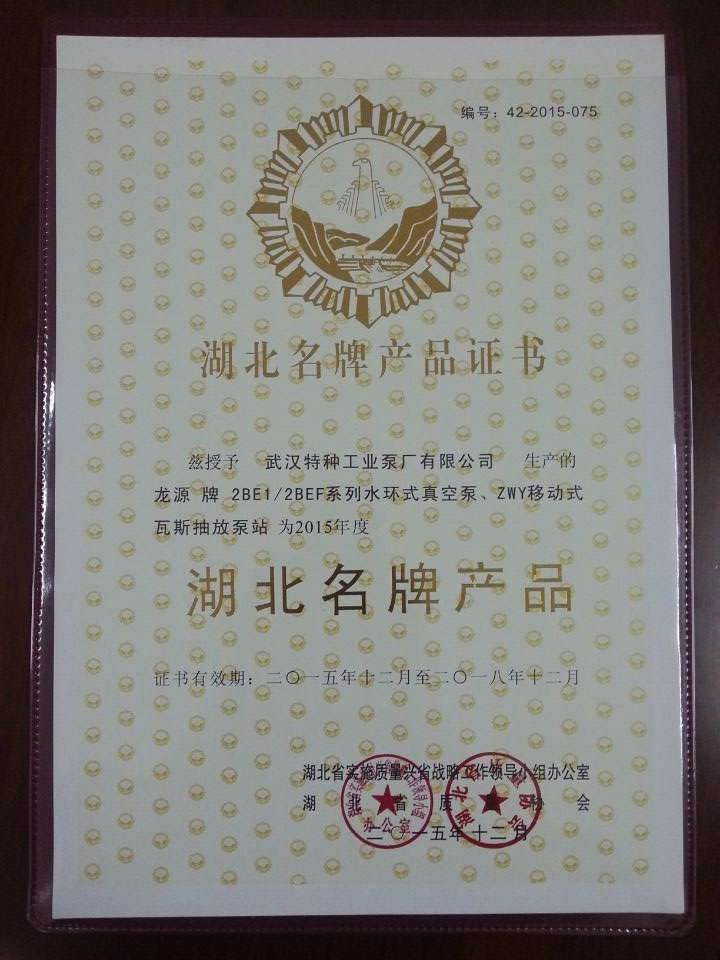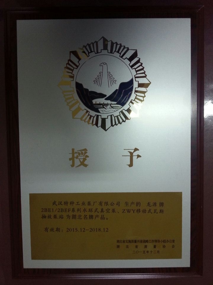 近日,武漢特種工業(yè)泵廠有限公司生產(chǎn)的龍?jiān)磁?BE1/2BEF系列水環(huán)式真空泵、ZWY移動(dòng)瓦斯抽放泵站,被湖北省實(shí)施質(zhì)量興省戰(zhàn)略工作領(lǐng)導(dǎo)小組辦公室、湖北省質(zhì)量協(xié)會(huì)授予“湖北省名牌產(chǎn)品”稱號(hào)(證書編號(hào):42-2015-075,有效期:2015年12月至2018年12月),并舉行了授牌儀式。