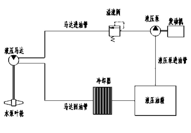 液壓型:首先由牽引車將移動(dòng)式液壓泵站移至作業(yè)地點(diǎn),并鋪好出水軟管,再啟動(dòng)柴油機(jī)帶動(dòng)液壓油泵運(yùn)行,液壓泵從液壓油箱中抽取液壓油并使液壓油壓力升高,然后高壓液壓油通過控制閥組件、管路、流入液壓馬達(dá),帶動(dòng)液壓馬達(dá)旋轉(zhuǎn)驅(qū)動(dòng)水泵。高壓油流經(jīng)液壓馬達(dá)做功后,壓力降低,經(jīng)液壓馬達(dá)回油□流出,進(jìn)入冷卻器降溫,再流回液壓油箱。工作原理圖如下: