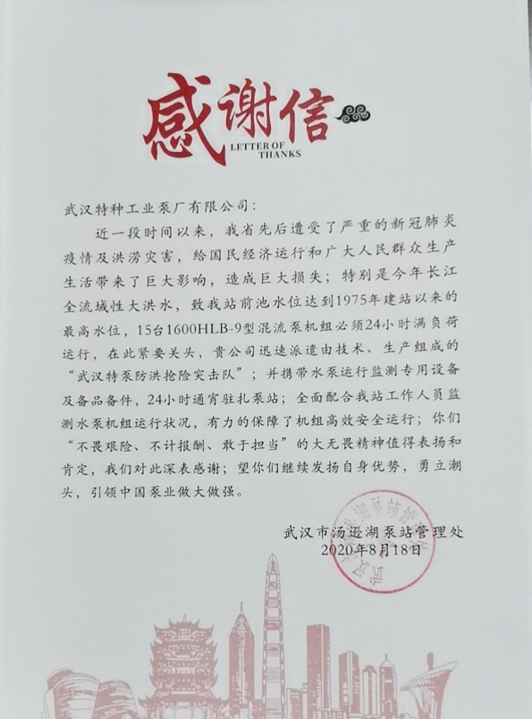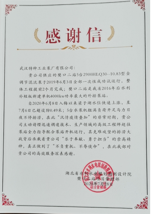 湯遜湖泵站給我公司寄來(lái)的感謝信