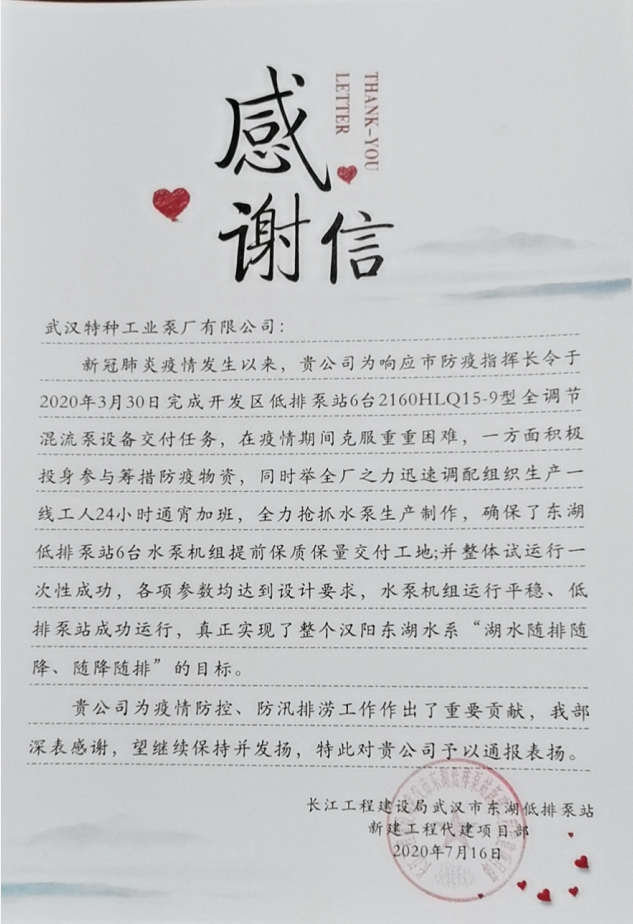 東湖低排泵站給我公司寄來(lái)的感謝信